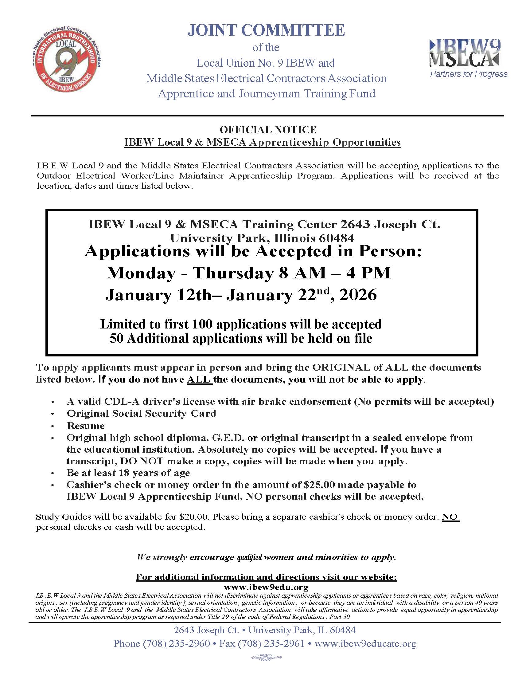 We are pleased to announce that I.B.E.W. Local 9 and the Middle States Electrical Contractors Association will begin accepting applications for the Outdoor Electrical Worker/Line Maintainer Apprenticeship Program on January 12, 2026.